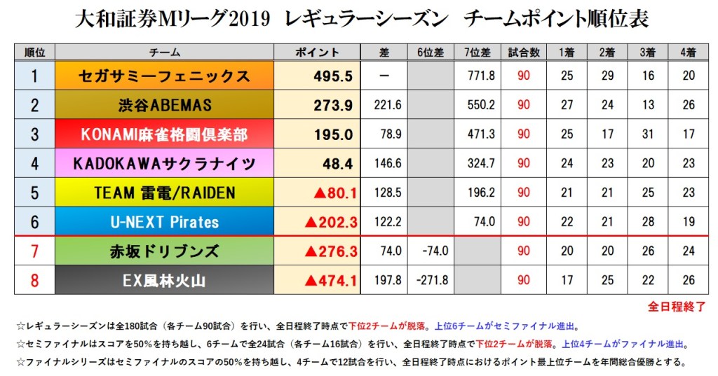常規賽季在昨日(3/9)告一個段落了,最後風林火山一如預期的被刷掉,Pirates和Drivens如筆者所預料的各自派出小林和村上分別連鬥,最後在小林1位3位、村上3位4位(兩人並非直接對戰)的情況下沒有上演逆轉劇,由Pirates出線。剩餘5隊則沒有懸念的晉級,晉級後的分差至少都有40pt。