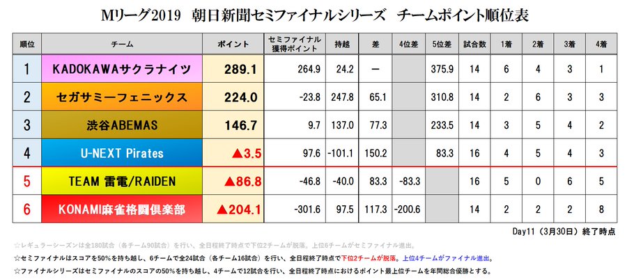 本日(3/31)是M.LEAGUE 2019準決賽賽季的最後一個比賽日,能出線至決賽賽季的隊伍也幾乎確定了。